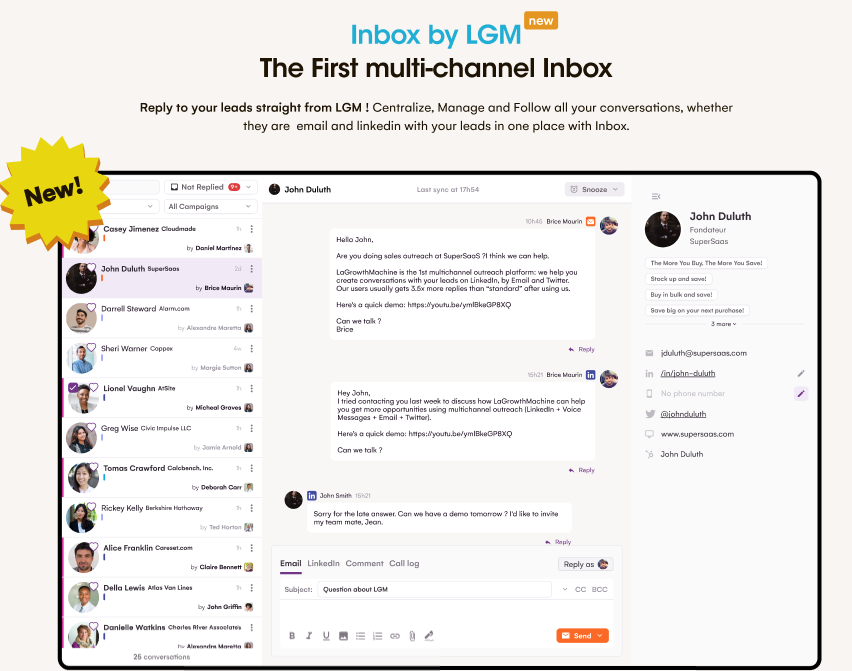 După cum am menționat mai devreme, aici strălucește LaGrowthMachine! Instrumentul nostru nu numai că vă permite să creați și să programați secvențe multicanal, să urmăriți clienții potențiali, dar puteți face toate acestea într-un singur loc!
