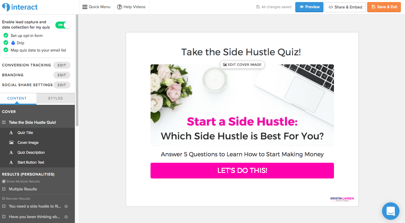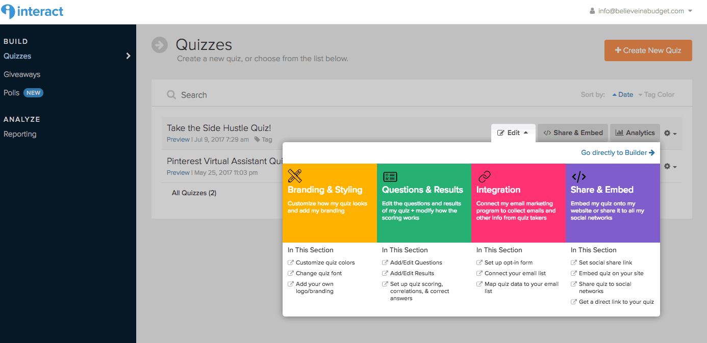 Atunci când creați un chestionar, un sondaj sau un giveaway cu Interact, aveți și opțiunea de a configura personalizări în back-end. Aceasta include lucruri precum integrările de e-mail, Google Analytics și multe altele. Dacă cineva este nou și îmi vizitează site-ul web și face un test, îmi place să ofer rezultatele prin e-mail!