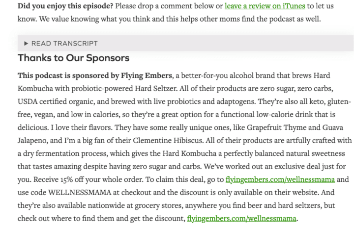 Например, в подкасте Wellness Mama есть пост для каждого эпизода подкаста, и в этом посте они представляют своего приглашенного докладчика и выделяют важные моменты в подкасте.
