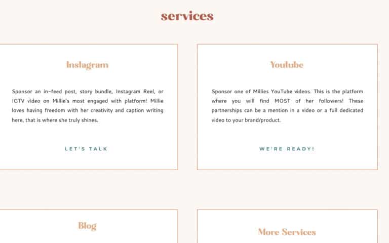 Например, вот Милли Адриан — влиятельный человек в Instagram — из It's Modern Millie, и на ее веб-сайте есть страница бренда с подробной информацией о ее статистике и влиянии в Интернете.