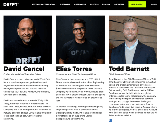 Вот пример из Drift, платформы конверсионного контент-маркетинга, и страницы их руководящей команды.