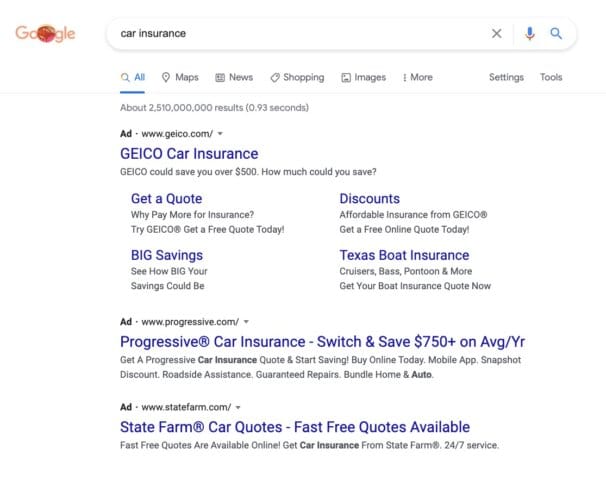 Вот пример рекламы с оплатой за клик по поисковому запросу автострахование .