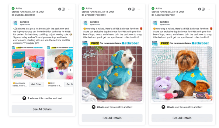 Например, BarkBox, служба подписки на домашних животных, показывает много рекламы в Facebook для своей стратегии.