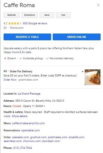 Из-за категории этого бизнеса Google позволяет им вводить дополнительные сведения, такие как ссылки на меню и каналы заказа.