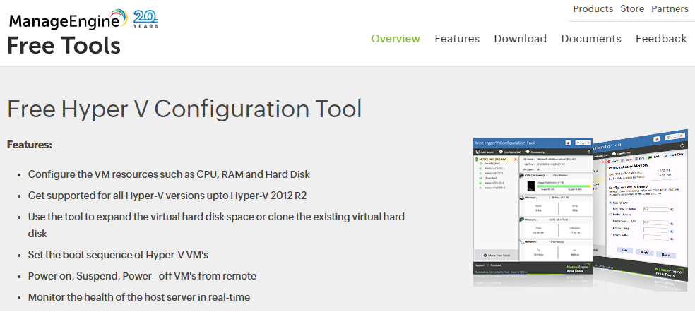 ManageEngine OpManager предлагает бесплатную серверную утилиту Hyper-V, которая помогает настраивать ресурсы виртуального сервера Hyper-V, такие как процессор, память и жесткий диск, а также помогает удаленно включать и выключать серверы.