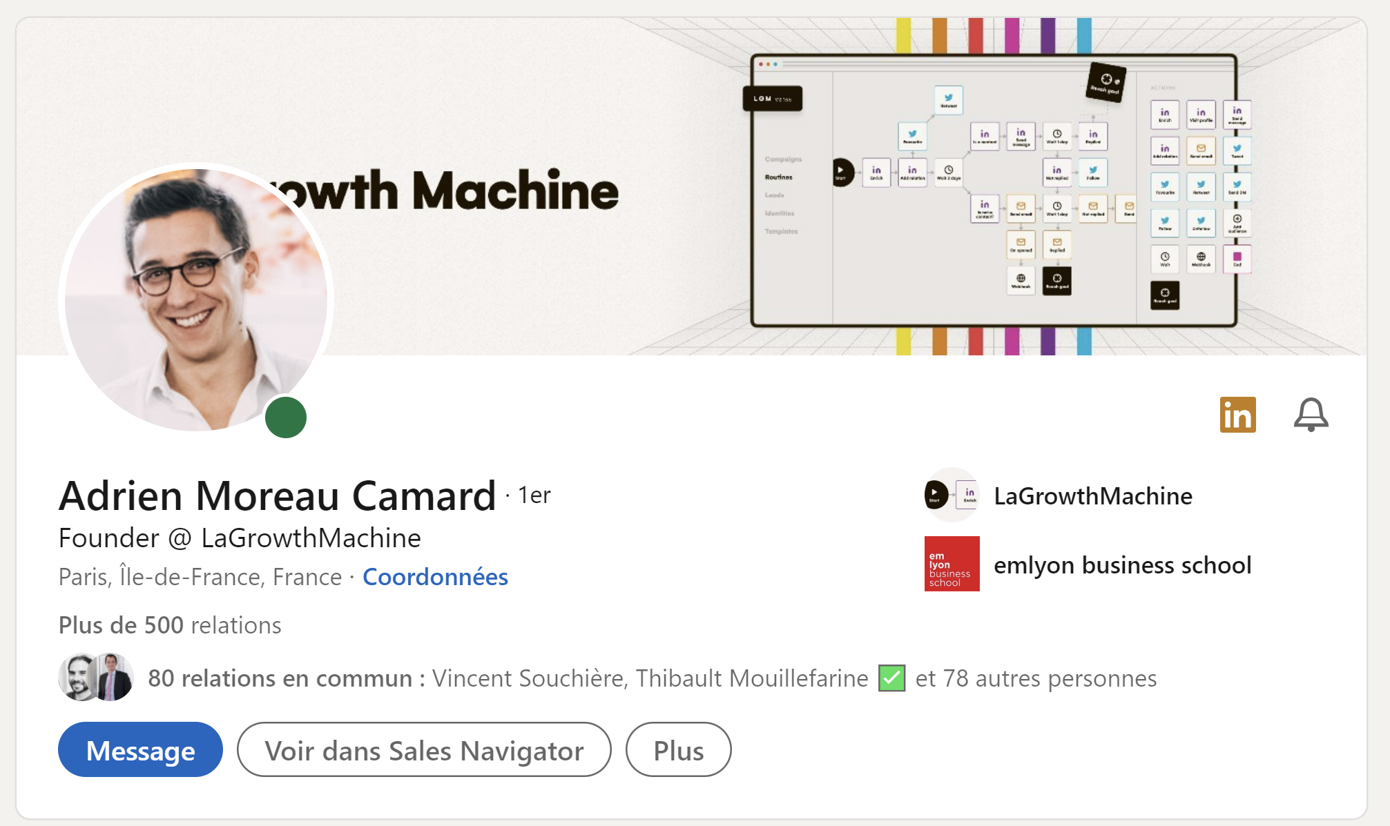 Sales Navigator также очень хорошо работает с LaGrowthMachine ! Действительно, у наших клиентов есть знакомый рабочий процесс, который позволяет им автоматически генерировать высококвалифицированных потенциальных клиентов B2B.
