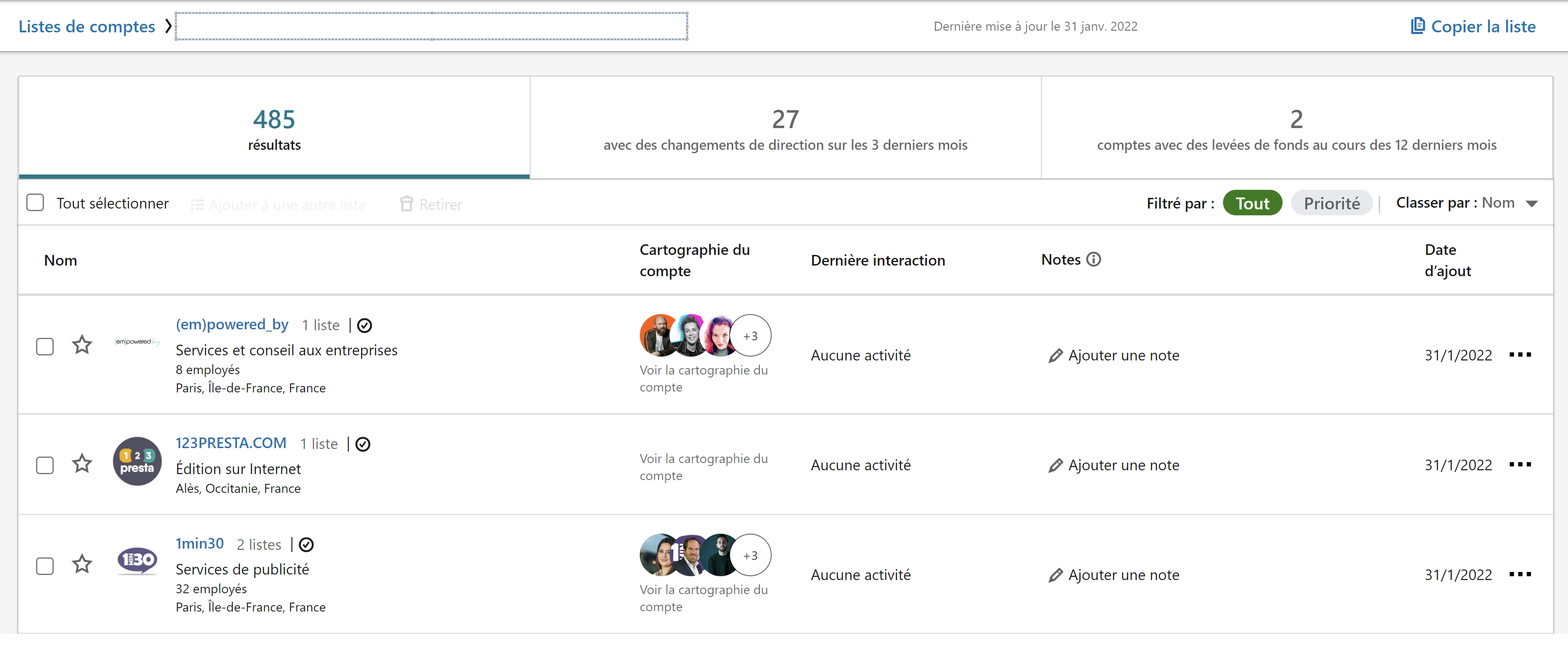 Затем вы можете искать учетные записи (поиск по бренду) или потенциальных клиентов (поиск по названию должности, например, все менеджеры ресторанов в Бордо). Подход немного отличается, но оба преследуют одну и ту же цель: привлечение новых клиентов.