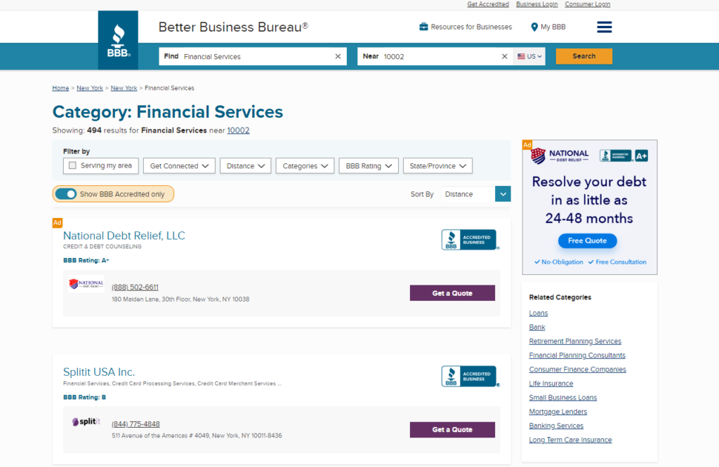 В своих списках пользователи могут искать только предприятия, аккредитованные BBB, ИЛИ все предприятия, которые включают бесплатную учетную запись. В каждом объявлении есть список жалоб от потребителей, средний рейтинг, а также ваш NAP.