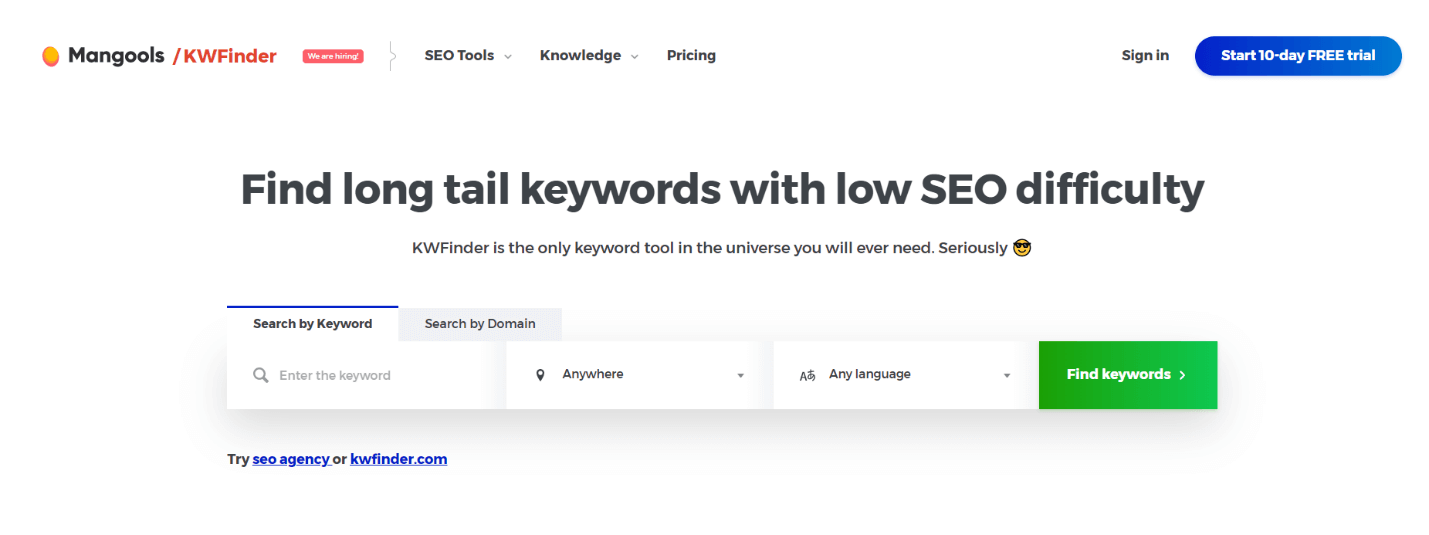 KWFinder — это доступный, точный и простой в использовании инструмент для поиска длинных и коротких ключевых слов в вашем контенте. Вы должны ввести ключевое слово seed, и KWFinder предоставит вам сотни предложений.