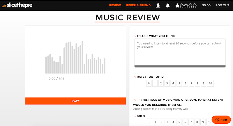 Писать обзоры для Slicethepie довольно просто. Если вы делаете рецензию на музыку, вы должны прослушать не менее 90 секунд трека, но вы можете сделать рецензию во время прослушивания.