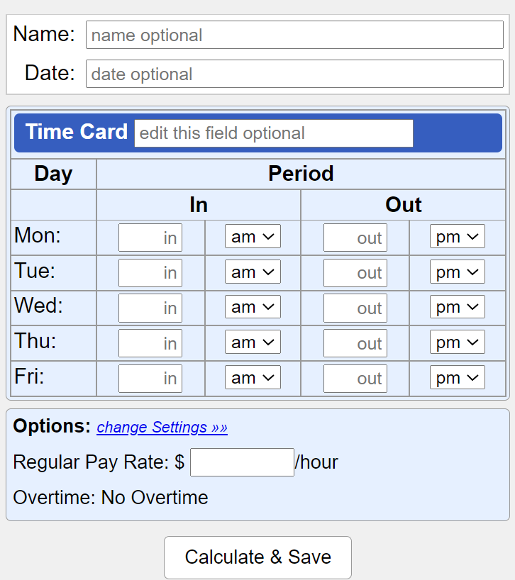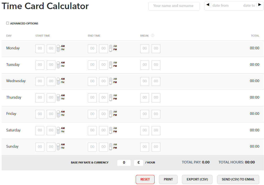 Калькулятор Soup разработал Калькулятор тайм-карт для отслеживания перерывов и рабочего времени и расчета ежемесячных, еженедельных или почасовых платежей сотрудников. Инструмент также автоматически вычитает перерывы из рабочего времени, введенного и нерабочего времени сотрудников. Пользователи могут начать с ввода даты, имени сотрудника, времени прихода и ухода, а также обычной ставки заработной платы для расчета заработной платы. Пользователи также могут включать сверхурочные часы для расчета заработной платы.