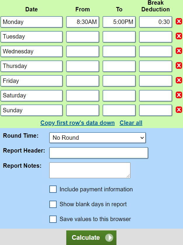 Чтобы использовать Calculator.net, пользователи могут начать с ввода рабочих часов (от начала до конца) и времени вычета перерыва, включая время раунда, заголовок отчета и примечания, а затем начать расчет. Если пользователям необходимо включить платежную информацию, отчет о пустом дне и сохранить значения в браузере, отметьте контрольный список, введите данные и начните расчет.
