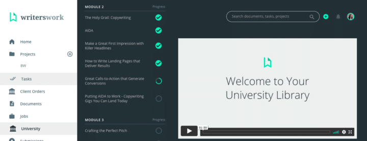 Наконец, есть Университет работы писателей, который дает вам доступ к образовательным урокам по письму и тому, как начать карьеру внештатного писателя.