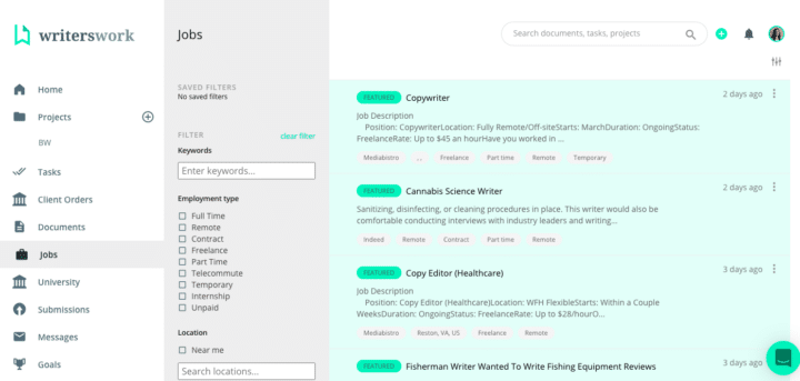 У вас есть опция поиска, где вы можете использовать ключевые слова, чтобы найти письменные работы в своей нише. Вы также можете отфильтровать результаты поиска по таким параметрам, как тип занятости (полный рабочий день, фриланс, контракт и т. д.), зарплата, местоположение и источник (из какой доски объявлений находится список).