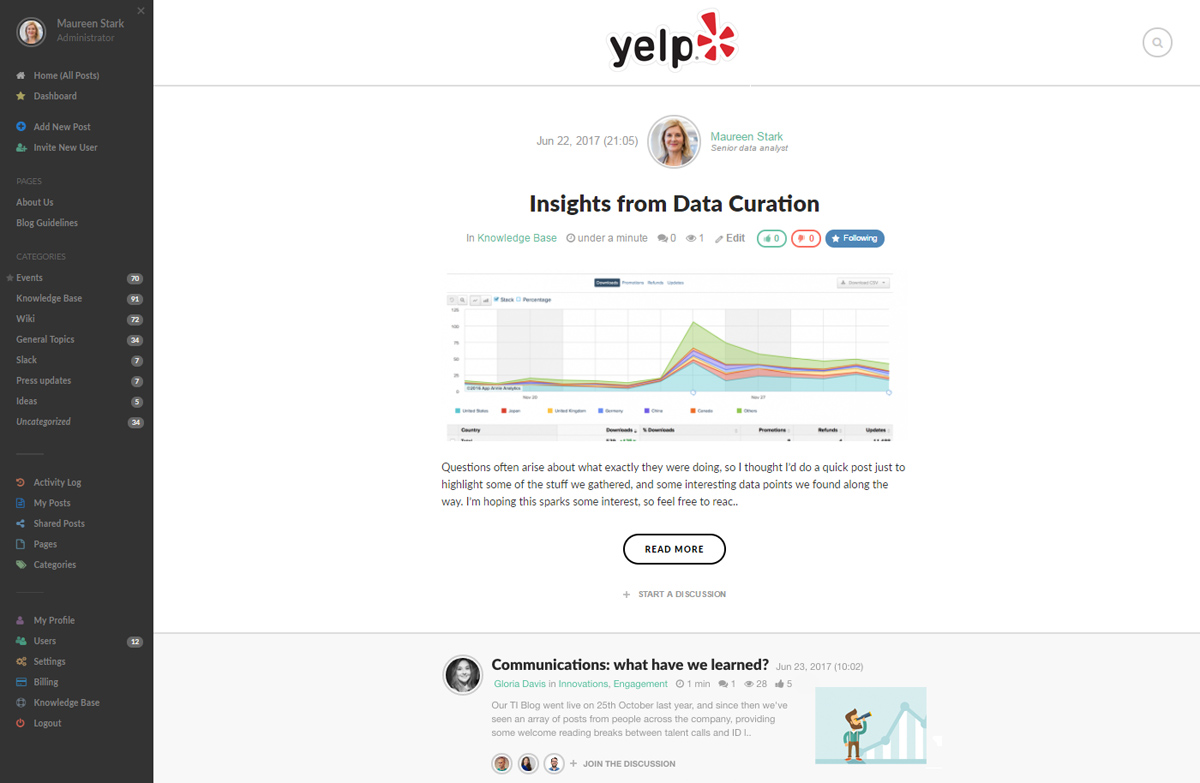 Внутренний блог действует как центральный информационный центр или «виртуальная доска объявлений» для компании, позволяя всем сотрудникам быть в курсе того, что происходит в офисе и за его пределами. В то же время блог открывает новый, прозрачный, двусторонний канал связи внутри организации, где каждый может задать вопрос и получить информацию, необходимую для принятия более быстрых и разумных решений. Внутренний блог интуитивно понятен и прост в использовании, поэтому каждый может быстро присоединиться к нему, что является одной из причин, почему он так хорошо работает в качестве инструмента внутренней коммуникации.