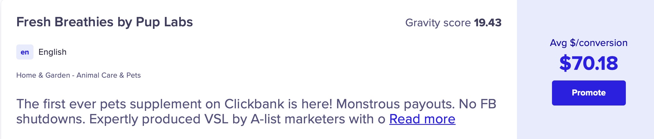 ต่อไปนี้คือตัวอย่างตัวเลือกสำหรับอุตสาหกรรมสัตว์เลี้ยงจากตลาดพันธมิตร Clickbank คุณสามารถดูค่าเฉลี่ย $ ต่อการแปลงบนแดชบอร์ด