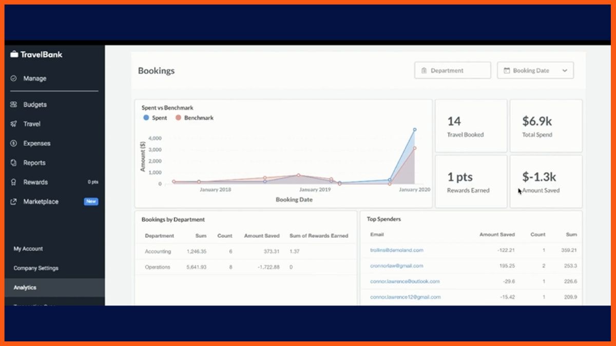 เป็นแพลตฟอร์มเดียวที่คุณต้องจัดการบัตรจริงและบัตรเสมือนสำหรับค่าใช้จ่ายในการเดินทางขององค์กร และการจองโรงแรมและเที่ยวบินพร้อมดีลพิเศษ เงินคืน และรางวัล นโยบายการเดินทางขององค์กรมีบทบาทสำคัญในธุรกิจ ซอฟต์แวร์นี้จัดทำรายงานตามเวลาจริงเพื่อให้แน่ใจว่ามีการตัดสินใจทางธุรกิจและนโยบายที่ดีที่สุดในระดับเดียวกัน