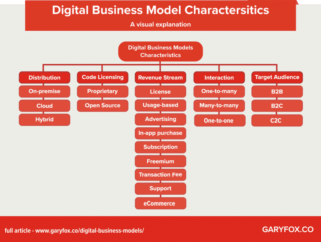 หากเรามุ่งเน้นไปที่รูปแบบธุรกิจดิจิทัลประเภทต่างๆ อย่างที่เป็นอยู่ตอนนี้ เราจะเห็นว่าพวกเขาจะเปลี่ยนไปอย่างไร แผนภาพด้านล่างแสดงลักษณะโมเดลธุรกิจดิจิทัลในปัจจุบัน