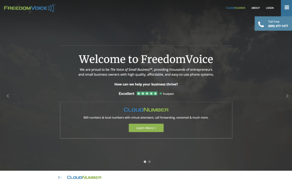FreedomVoice เป็นผู้ให้บริการหมายเลขโทรฟรีมากว่าสองทศวรรษ เป็นหนึ่งในธุรกิจที่มีชื่อเสียงมากที่สุด และเสนอแผนราคาแบบนาทีต่อนาทีในราคาประหยัดเริ่มต้นที่ 400 นาที