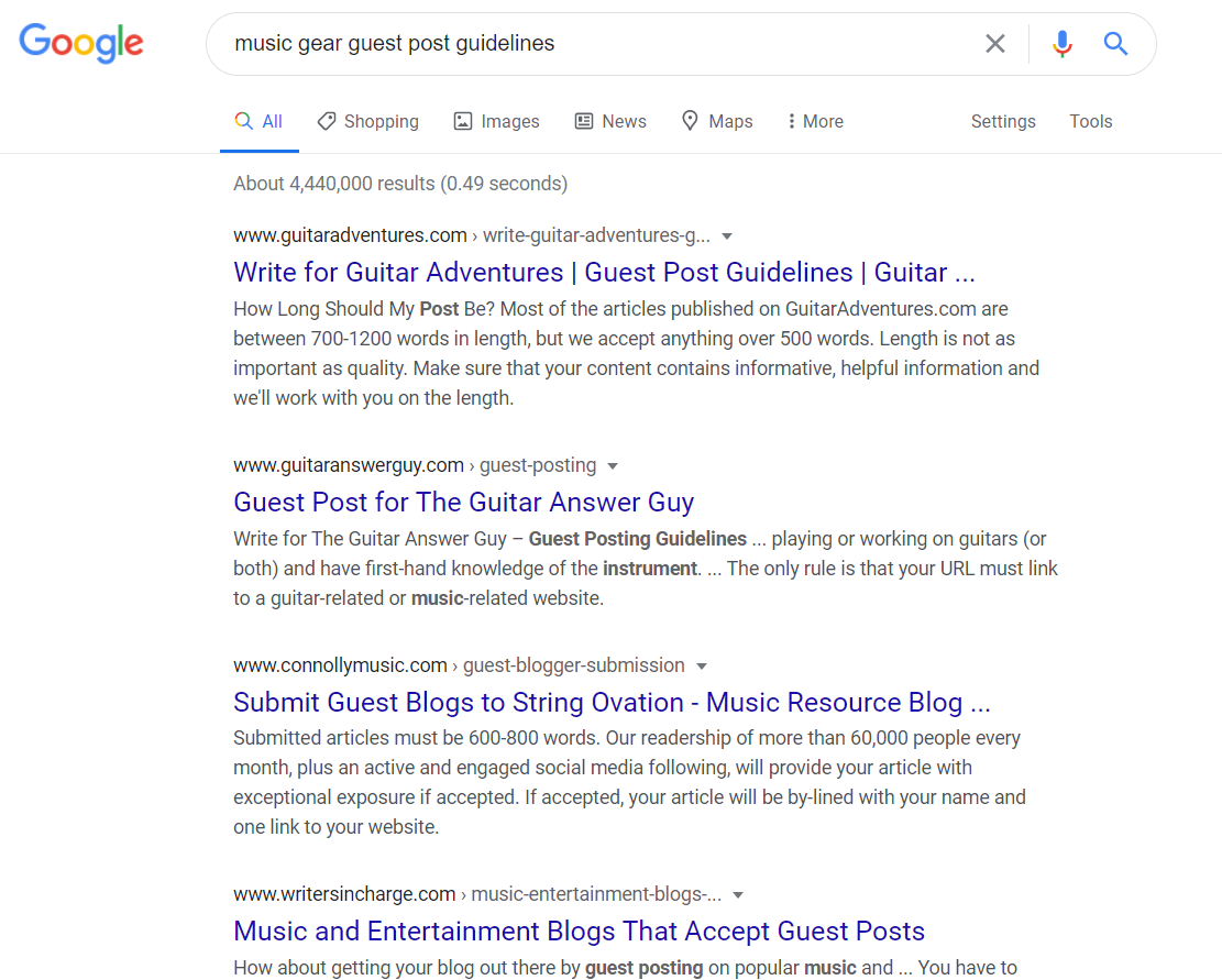 - ค้นหาเว็บสำหรับบล็อกที่เกี่ยวข้องกับช่องหรืออุตสาหกรรมของคุณในทางใดทางหนึ่ง หากคุณกำลังขายเครื่องดนตรี การค้นหาของคุณจะมีลักษณะดังนี้: แนวทางการโพสต์สำหรับแขกอุปกรณ์ดนตรี