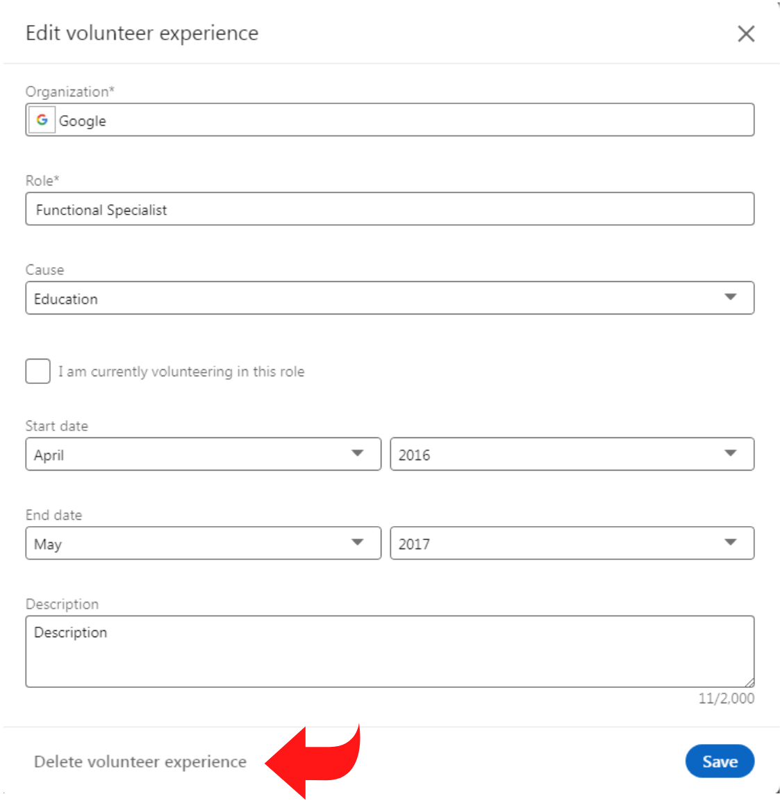 ด้วยวิธีนี้ สิ่งสำคัญคือต้องจดจำวันที่ของประสบการณ์ของคุณไว้ในใจ ตัวอย่างเช่น หากคุณกำลังทำงานที่นี่ ให้พูดถึงเรื่องนี้ ถ้าไม่เช่นนั้น ให้เลือกวันที่สิ้นสุดสำหรับประสบการณ์ นอกจากนี้ อย่าลืมว่า LinkedIn จะแสดงประสบการณ์อาสาสมัครล่าสุดของคุณโดยอัตโนมัติที่อันดับ 1