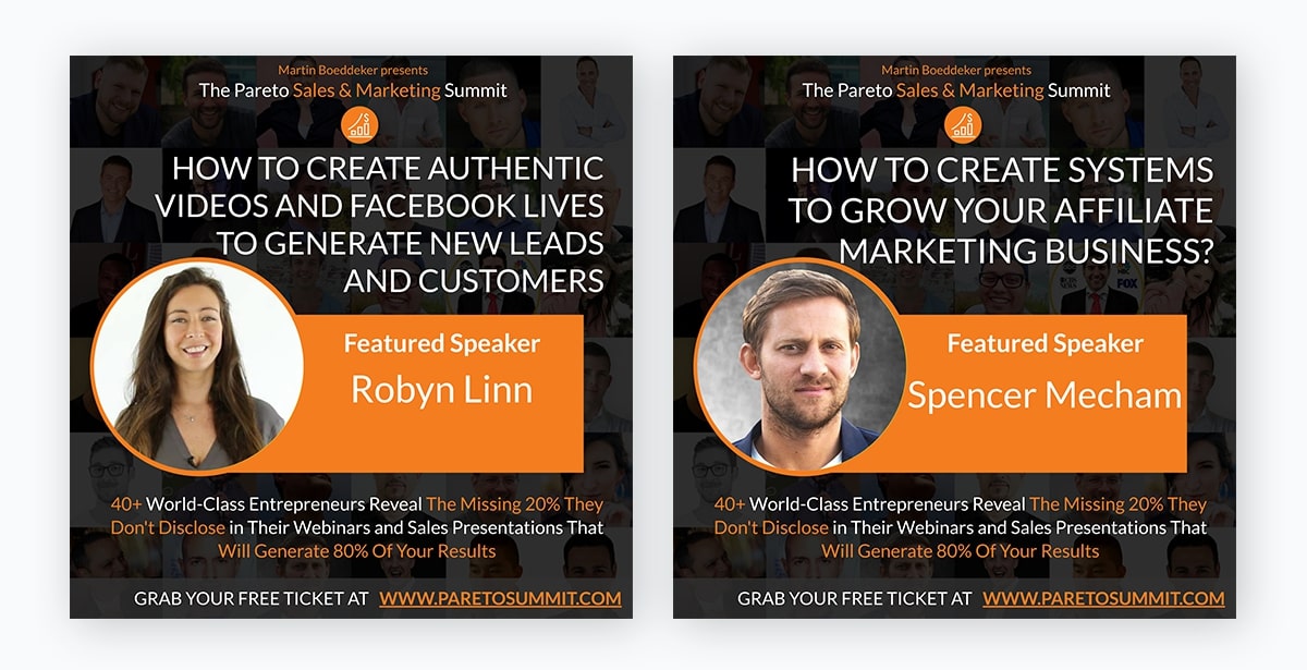 Profesyonel İpucu: Aşağıdaki gibi, her biri bir konuşmacı içeren e-el ilanları tasarlayın ve konuşmacının hedef kitlenize getireceği özel değeri vurgulayın. Bunu çeşitli reklam kanallarınıza dağıtın.