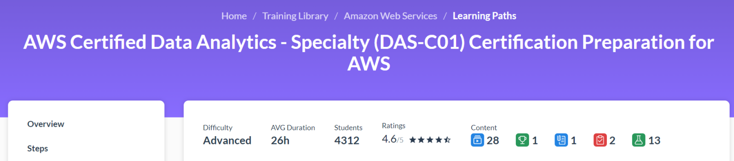 AWS sertifikalı bir yazar, bu AWS Certified Data Analytics – Specialty (DAS-C01) öğrenme yolunu hazırladı. Çalışma rotası boyunca ilerlerken, her konuda tam bir ustalık geliştirerek, alan gereksinimlerini karşılamak için gerekli tüm bilgi ve becerileri edinmenize yardımcı olacaktır.
