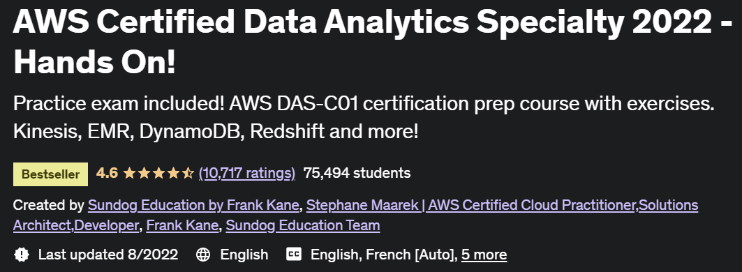 Veri analitiği (BigData, Hadoop, Spark) geçmişine sahip değilseniz Hadoop'un temellerini öğrenmeniz önerilir, çünkü bu, bu hizmetleri ve araçları AWS Hizmetleri ile hızlı bir şekilde bağlamanıza önemli ölçüde yardımcı olacaktır. Udemy'de çok sayıda BigData/Hadoop kursu vardır.