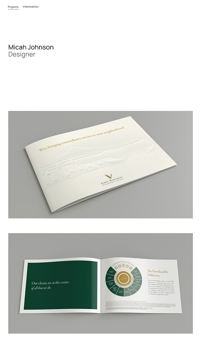 Micah Johnson'ın web sitesi, az çoktur'un en somut örneğidir. Sade, berrak sans serif yazı tipinden düz beyaz arka plana kadar her şey, izleyicinin gözünü sayfanın en önemli bölümlerine, Micah'ın adına, tasarımcı olarak mesleğine ve çalışmalarının örneklerine getirmeye çalışır. Micah'ın web sitesi, minimalizmin web sitenizin düzenindeki görsel hiyerarşiyi iyileştirmeye nasıl yardımcı olabileceğinin mükemmel bir örneğidir.