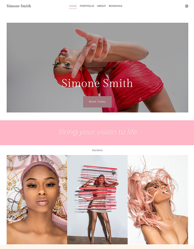 Simone Smith'in modelleme web sitesi, moda web siteleri için minimalizmin nasıl iyi çalıştığının çok iyi bir örneğidir. Simone güçlü yönlerine odaklanır ve izleyicinin dikkatini hemen çekmek için akılda kalıcı bir slogan kullanır. Renk şeması, minimalist web sitesi tasarım seçimlerini tamamlıyor ve hoş bir görsel deneyim sağlıyor. Moda web sitenize ilham verecek minimalist web sitesi örnekleri istiyorsanız, Simone'un web sitesi mutlaka görülmeli.