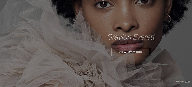 Graylon Everett, Amerikalı bir moda stilisti. Graylon, web sitesinin açılış sayfasını tek bir görüntü ve ana web sitesine girmenizi sağlayan bir düğme ile temiz ve minimalist tutar. Bu, kullanıcı üzerinde anında bir etki yaratmasını sağlar ve site ziyaretçilerini daha fazlasını keşfetmeye teşvik eden merak uyandırır.