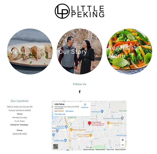 Minimalizmin işletme web sitelerine nasıl fayda sağlayabileceğini öğrenmek için minimalist web sitesi örnekleri arıyorsanız, başka yere bakmayın. Küçük Pekin restoranının web sitesi temiz, düzenli ve amacına uygun. Büyük düğmeler ayrıca görüntü olarak iki katına çıkar ve açılış sayfasına bir renk ve canlılık patlaması getirir. Sahiplerin resmi, tüm ticari web siteleri için çok önemli olan bir insanlık unsuru getiren ön ve merkezdir.