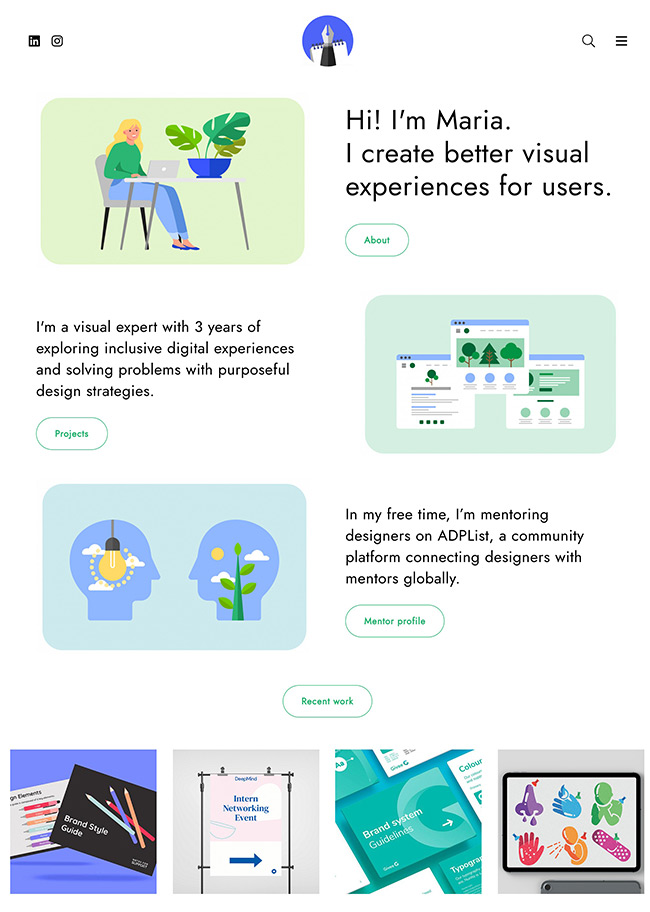 Maria Maka, müşterileri için daha iyi görsel deneyimler yaratmak için çalışan bir tasarımcıdır. Maria'nın web sitesi, minimal web sitelerinin ve minimalist tasarım uygulamalarının kullanıcılar için daha iyi ve daha sezgisel görsel deneyimler oluşturmaya nasıl yardımcı olduğuna dair mükemmel bir örnektir. Hem metin hem de resimler, sezgisel, minimal bir web sitesi deneyimi oluşturmak için kasıtlı ve amaçlı olarak kullanılır.