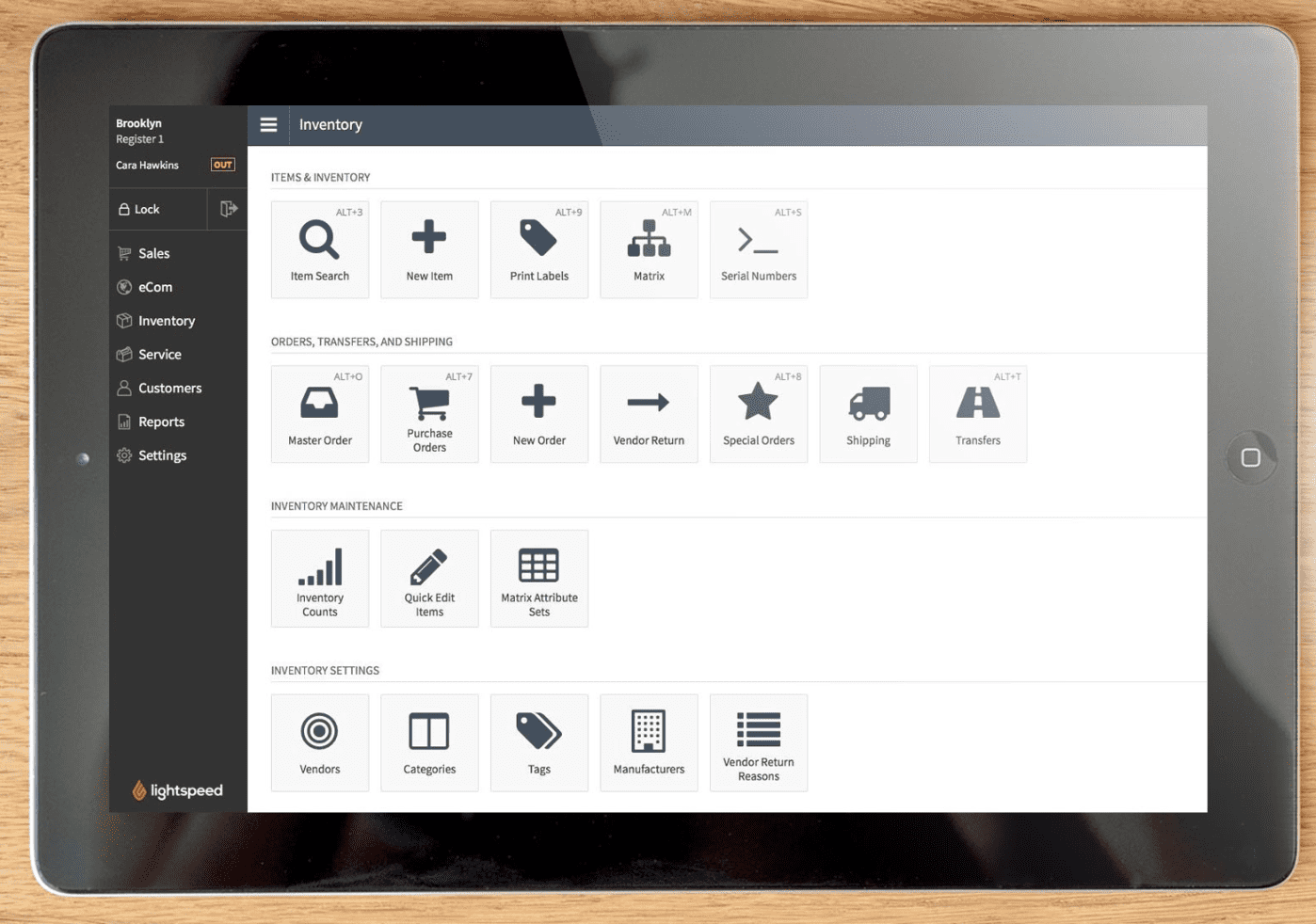 Envanter matrisleme sistemi, perakendecilerin ürün satmasını, ürünlere envanter etiketleri eklemesini ve bir satıcıya ürün eklemesini kolaylaştırır. Bir şey azaldığında, düşük stok uyarısı alırsınız ve ardından bir satıcı arayabilir ve aynı anda birkaç şey sipariş edebilirsiniz. Öğeleri satmak ve kiralamak istiyorsanız, Lightspeed'in kiralama pencerelerini, ücretleri ve daha fazlasını izleyen bir uygulaması vardır.