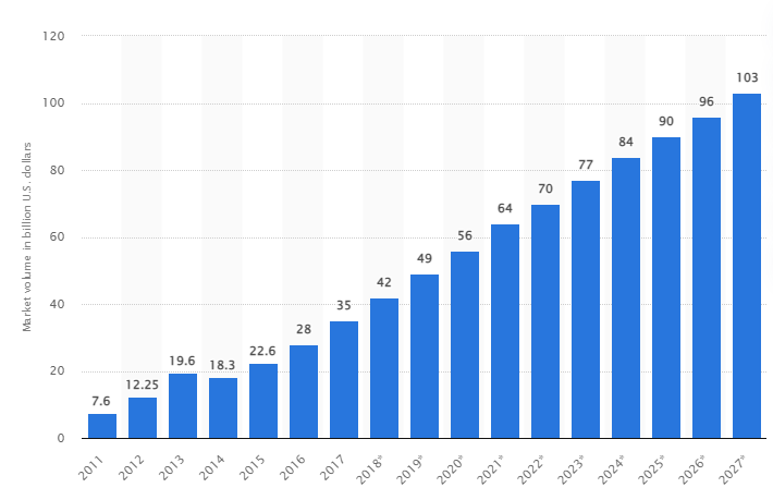 Bir araştırmaya göre, küresel büyük veri pazarının 2027 yılına kadar 103 milyar ABD dolarına, 2018'de beklenen pazar boyutunun iki katından fazla büyümesi bekleniyor.