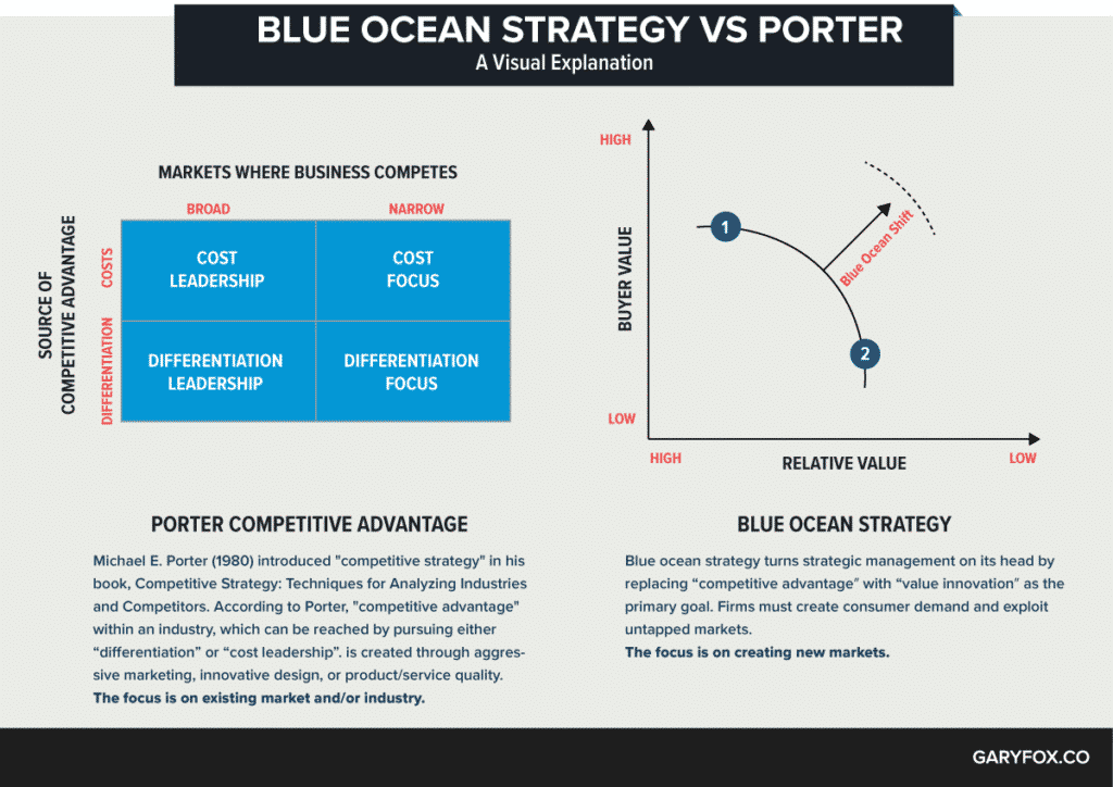 Piyasalar veya “mavi okyanuslar”, değer inovasyonu ile yaratılır ve aynı zamanda maliyetleri düşürür. Bu birleşik stratejiler, rekabeti etkili bir şekilde yener veya kendi ifadeleriyle “ rekabeti önemsiz kılar ”. Başka bir deyişle, başarının anahtarı, kendi oluşturabileceğiniz ve ardından kendi pazarınızı oluşturabileceğiniz bir pazar bulmaktır.