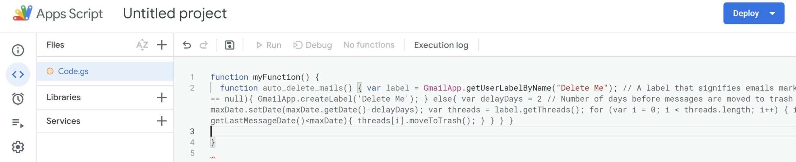 Herhangi bir JS kodunda olduğu gibi, e-posta görevlerini belirli sayıda gün sonra silmek gibi e-posta görevlerini otomatikleştirmek için Google Script aracılığıyla konsolda otomasyon kuralları oluşturabilirsiniz.