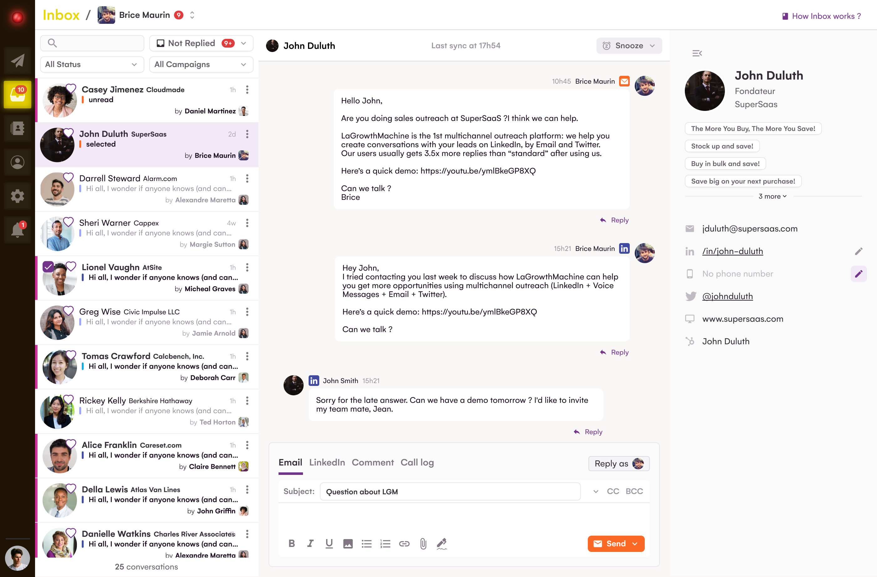 LaGrowthMachine, çok kanallı otomatik diziler aracılığıyla dönüşüm oranınızı optimize ederken çok zaman kazanmanıza olanak tanıyan bir satış otomasyon aracıdır.