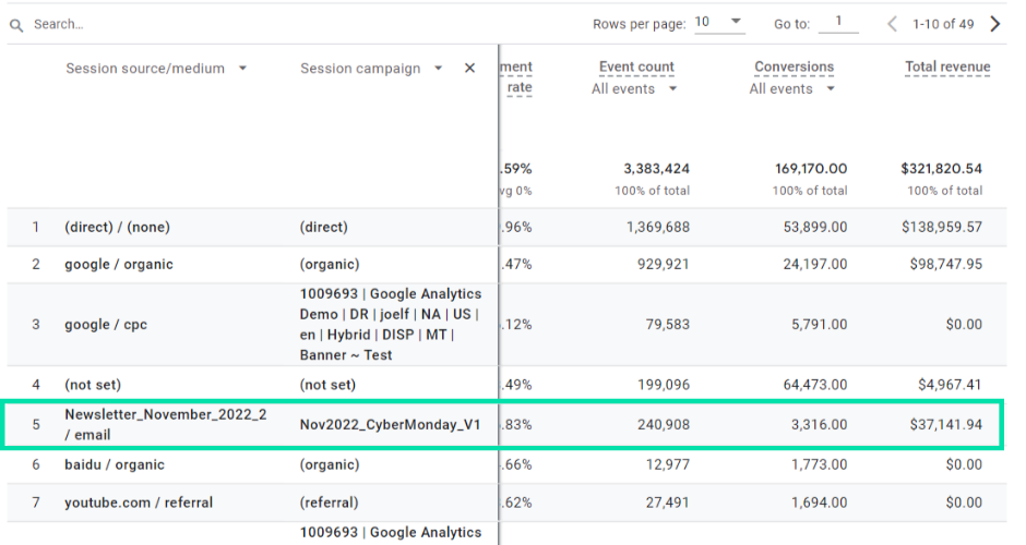 Yukarıdaki örnekte, " Nov2022_CyberMonday " in bir e-posta kampanyası olduğunu görebilirsiniz. Bu kampanyanın gelir üzerinde en büyük etkiye sahip olduğu düşünüldüğünde, paramızın karşılığını daha fazla almak için bu kampanyaya ve kanala daha fazla bütçe yatırmak tamamen mantıklıdır.