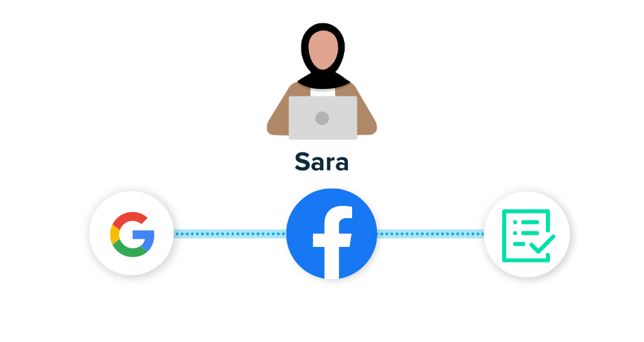 İki gün sonra Sara, bir Facebook yeniden hedefleme reklamına tıkladıktan sonra aynı cihazı kullanarak web sitenize geri döner. Bu oturum sırasında Sara, bir form doldurduktan sonra müşteri adayına dönüşür.