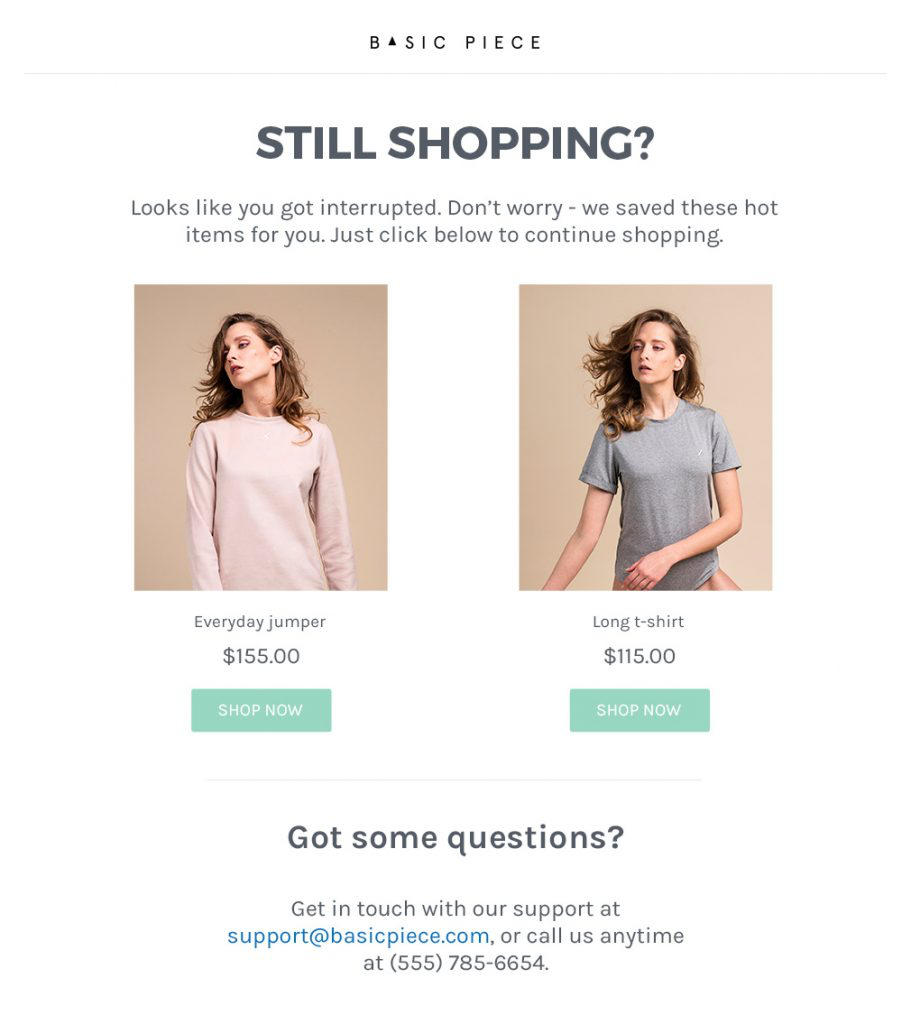 Bir müşteri adayı sitenizden ayrıldıktan sonra, bir saat kadar kısa bir sürede bir ilk takip gönderebilirsiniz. Bu noktada, markanız akıllarında hala taze ve ürünü hala istiyorlarsa teklifi yeniden gözden geçirme şansları yüksek. Bunu, ilgilenebilecekleri benzer öğeleri vurgulamak için bir fırsat olarak da kullanabilirsiniz.