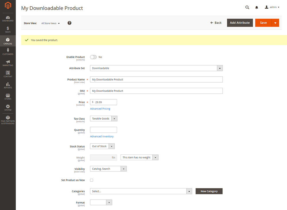 Varsayılan görünürlüğü bire ayarlayın, bir kategori belirleyin ve indirme veya DVD gibi ürün biçimini seçebilirsiniz. Ayrıca, malı yeni ürünler listesinde görüntülemek istiyorsanız, Ürünü Yeni Olarak Ayarla onay kutusunu işaretleyebilirsiniz. Daha fazla bilgi için ekstra özel alanlar eklemek için özellikleri de düzenleyebilirsiniz.