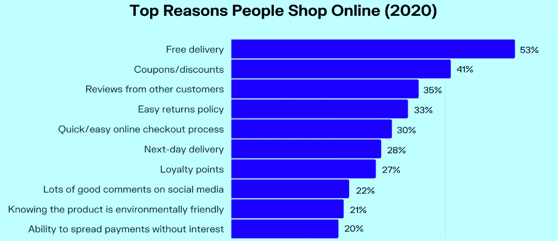 İstatistikler, e-ticaretin 2021'de 2,14 milyar alıcıya sahip olacağını gösteriyor. Yani dünya nüfusunun yaklaşık %27,2'si online alışveriş yapacak. Bunun ana nedeni ücretsiz kargo.