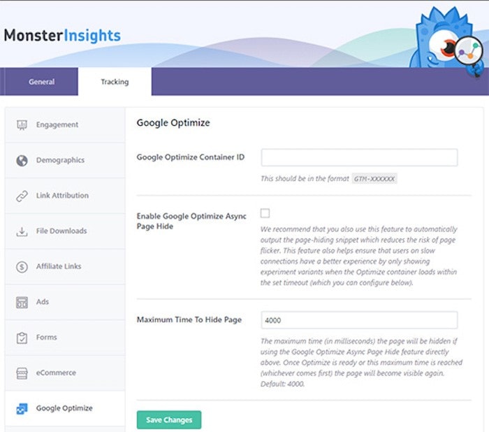 Google Optimize hesabınızı oluşturduktan sonra, sadece birkaç tıklamayla uygulayabileceğiniz MonsterInsights ayarlarınıza gidin: