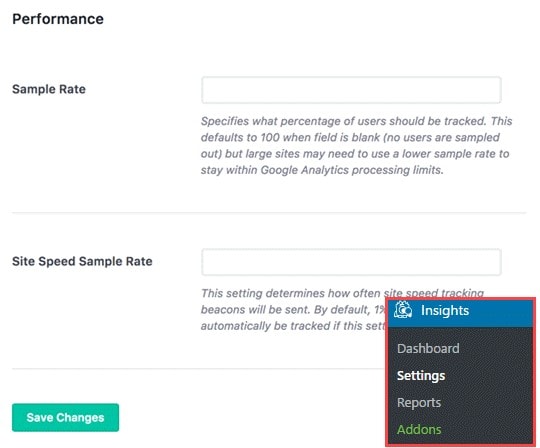 Bu sınır içinde kalmanıza yardımcı olmak için MonsterInsights Performance Addon, örnekleme hızını ve site hızı örnekleme hızını ayarlamanıza olanak tanır.