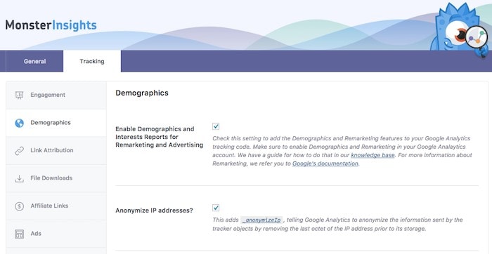 Ardından MonsterInsights'taki demografi kutusunu işaretlemeniz gerekir: