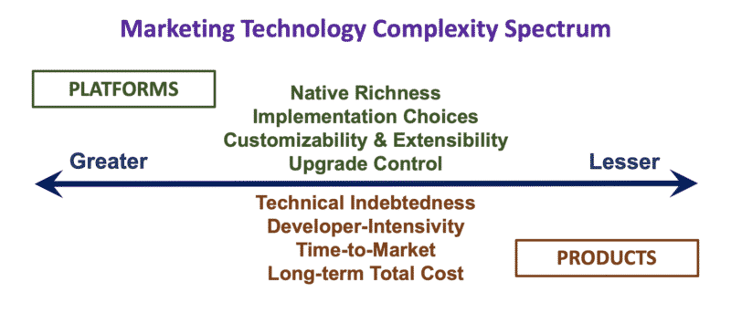 Bunun bir David vs. Goliath konuşması olduğunu varsayabilirsiniz ve küçük bir kısmı da öyle. Ancak platformlar ve ürünler, boyuttan çok daha fazlasıdır. Pazarlama teknolojisi alanında, daha fazla ürün benzeri çözümler, çok kanallı yolculuk düzenlemesi gibi daha geniş bir girişimden ziyade belirli bir kaşıntıyı - örneğin sosyal dinlemeyi - kaşıma eğilimindedir. Yine de daha önemli bir boyutun karmaşıklık etrafında döndüğüne inanıyorum: kuruluşunuzun daha zengin yeteneklere olan iştahı, ekibinizin daha ağır bir çözümde ustalaşma ve yararlanma yeteneği ve herhangi bir alanda iş hedeflerinizin basitliği.