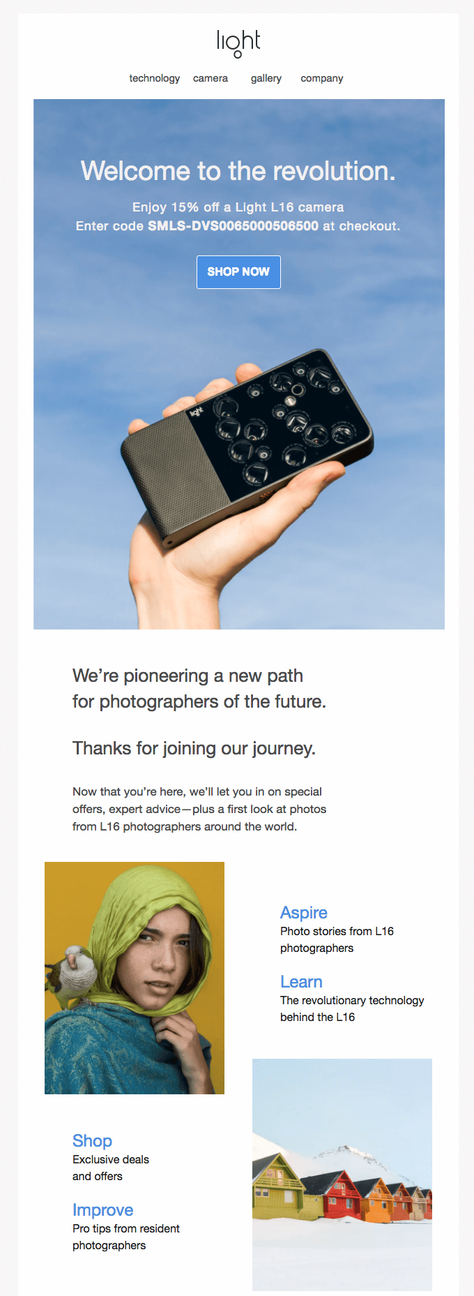 Light, yeni müşterilere %15 indirim sunar ve değer önerisini karşılama e-postalarında açıkça belirtir. (Kaynak)