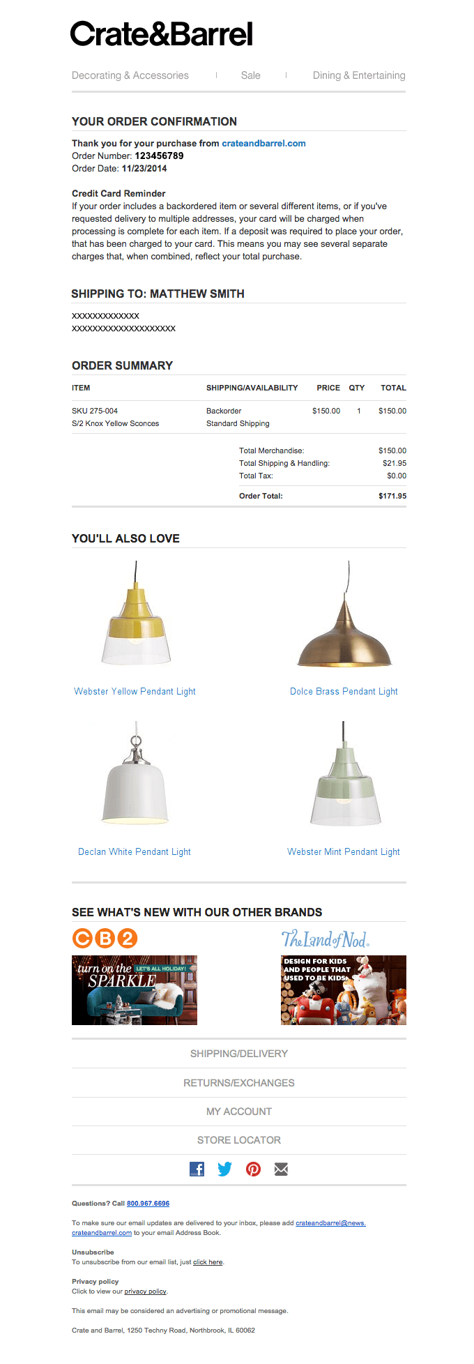 Crate & Barrel, sipariş onayı e-postalarında bir sipariş özeti içerir, ancak daha aşağıda ürün önerileri de sunar. (Kaynak)