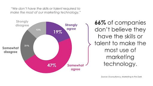 Sonuç olarak, bu boşluklar şirketinize ciddi paraya mal olan barikatlara dönüşüyor. Sıkıntılı bütçelerin, bütçeleriniz kesilmese de dondurulurken yatırım getirisini haklı çıkarmanızın beklendiği anlamına gelen zorlu bir ekonomide acı daha da belirgindir. İşte acı gerçek, iş profesyonellerinin %58'i, uygulamalarının yarısından azının pozitif bir yatırım getirisi sağladığını söylüyor. Bu arada, pazarlama ekiplerinin %66'sı mevcut teknolojilerini etkin bir şekilde kullanma becerilerine sahip olduklarına inanmıyor.